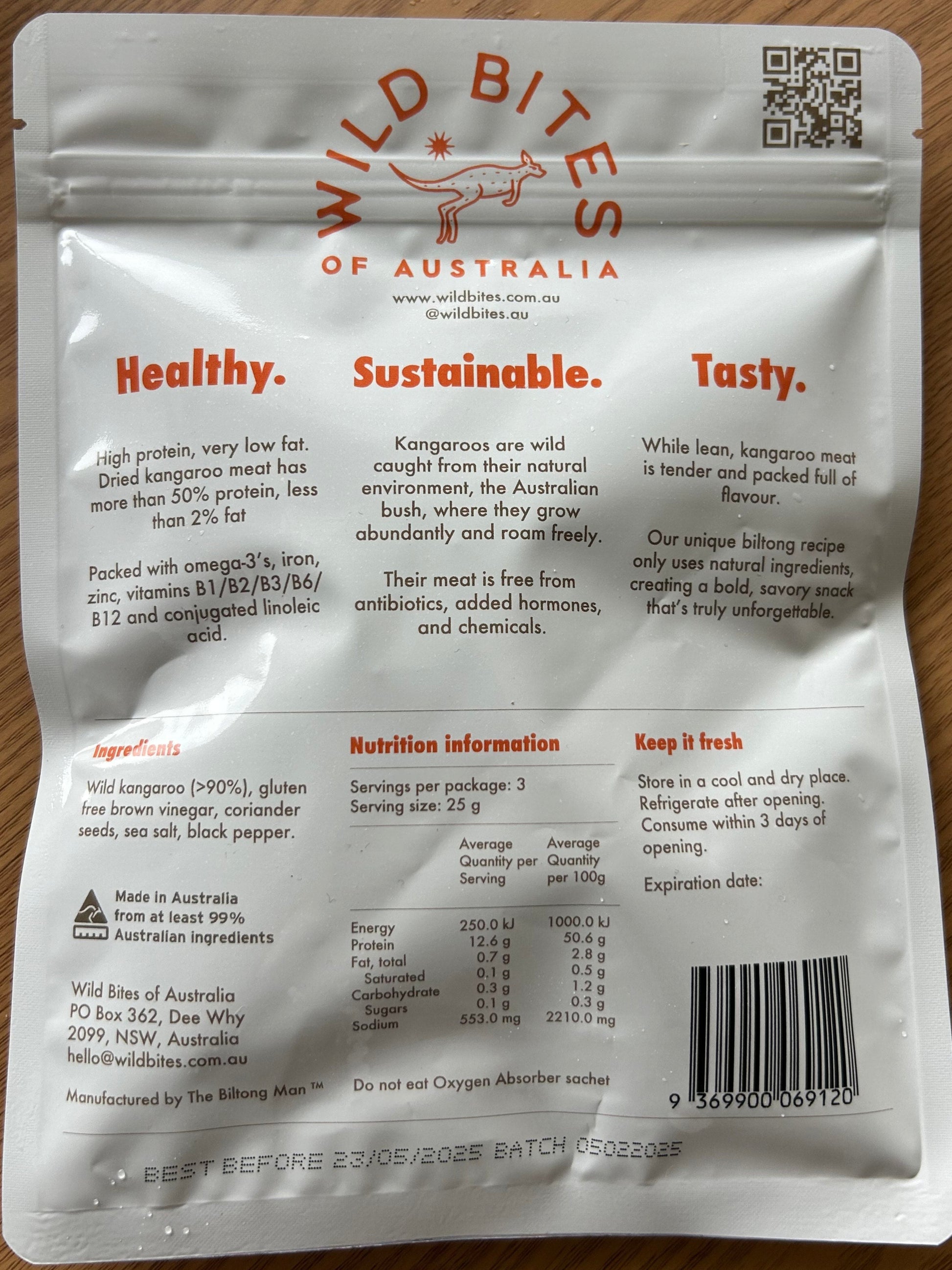 While lean, kangaroo meat is tender and packed full of flavour. Our unique biltong recipe only uses natural ingredients, creating a bold, savory snack that’s truly unforgettable.
